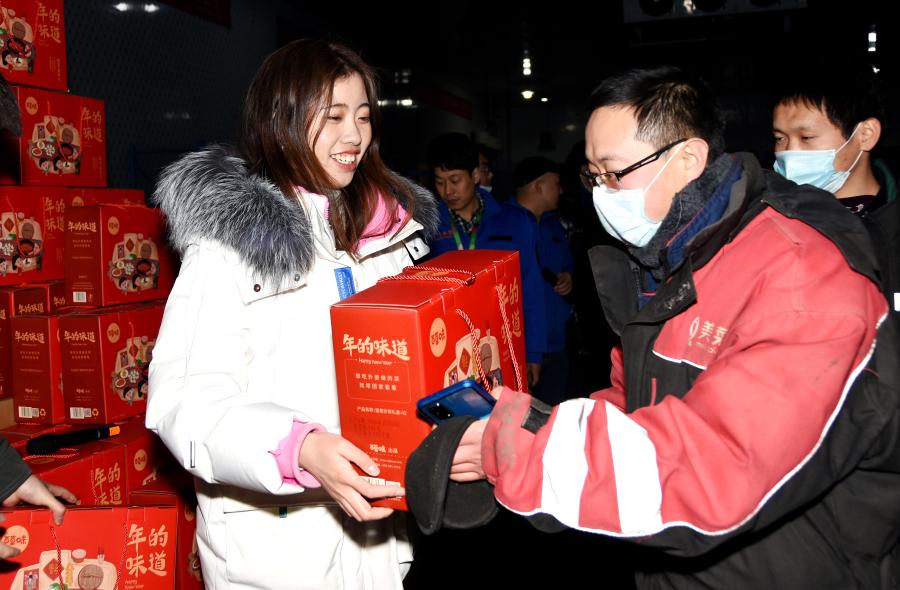 1月31日,北京昌平的一家民營(yíng)企業(yè)糧食蔬菜倉(cāng)儲(chǔ)車間內(nèi),留守崗位、“就地過年”的員工(右)在領(lǐng)取春節(jié)慰問品。新華社記者 潘旭 攝