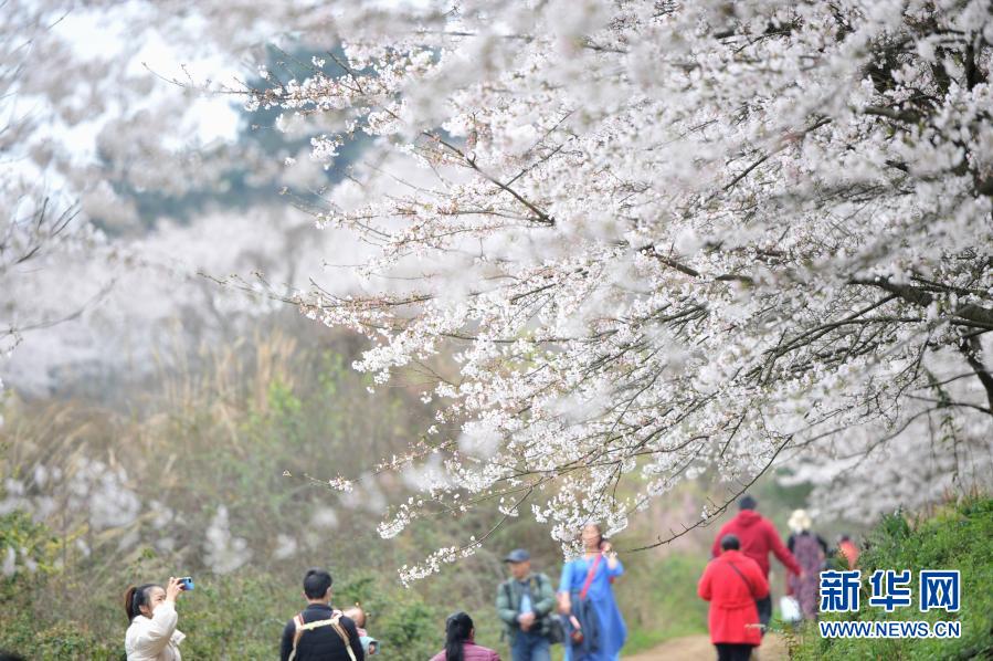 3月11日,游人在貴州省貴安新區(qū)的櫻花園內賞花游玩。