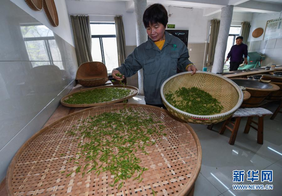 3月12日,在杭州市西湖風(fēng)景名勝區(qū)滿覺隴村的中國茶葉博物館滿覺隴炒茶中心內(nèi),茶農(nóng)把西湖龍井茶鮮葉進行攤青。