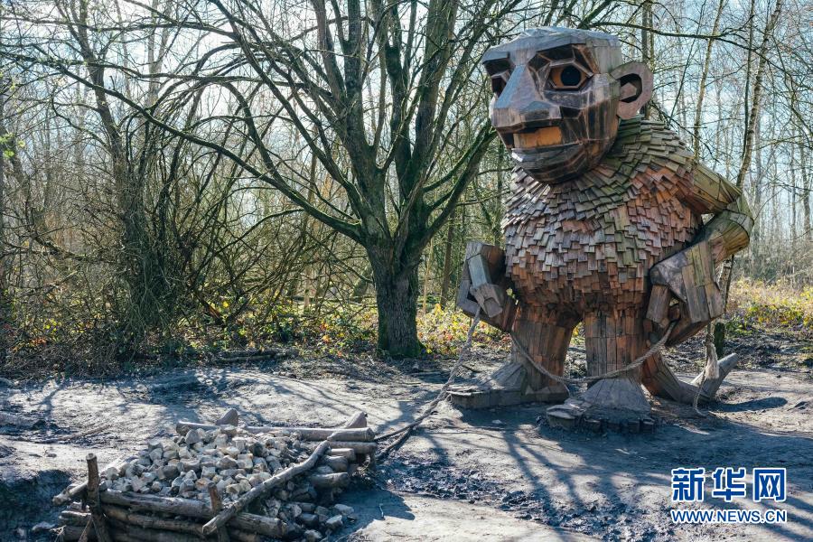 這是3月20日在比利時(shí)博姆市的德舒爾森林公園拍攝的一座“巨人”雕塑。新華社記者 張鋮 攝