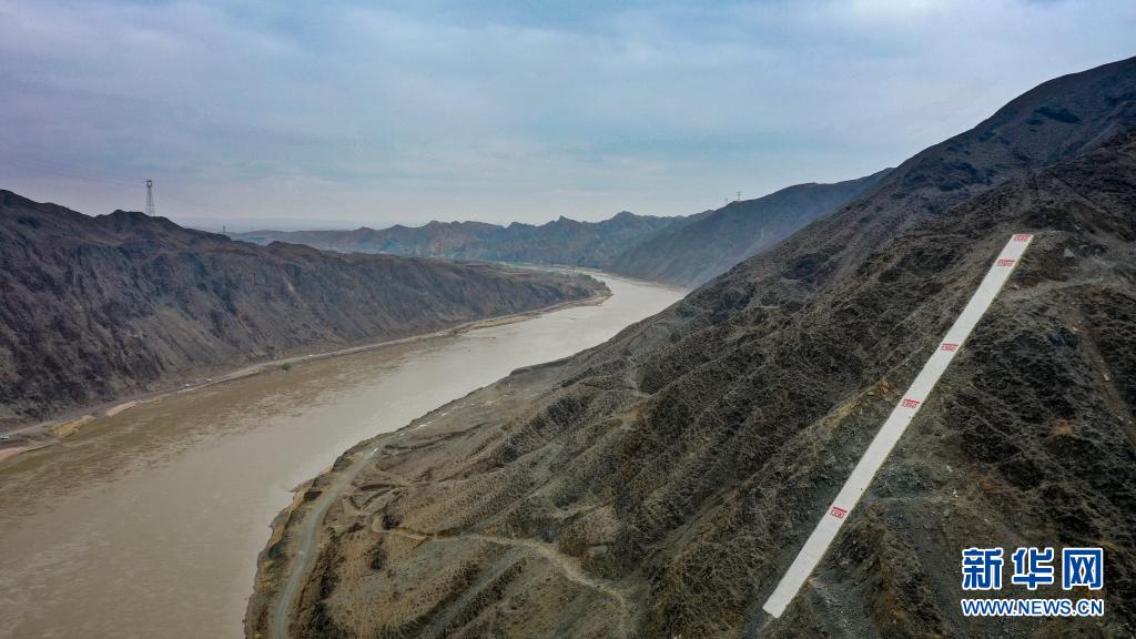 這是位于寧夏中衛(wèi)市黃河黑山峽河段的水位標(biāo)記(4月3日攝,無(wú)人機(jī)照片)。