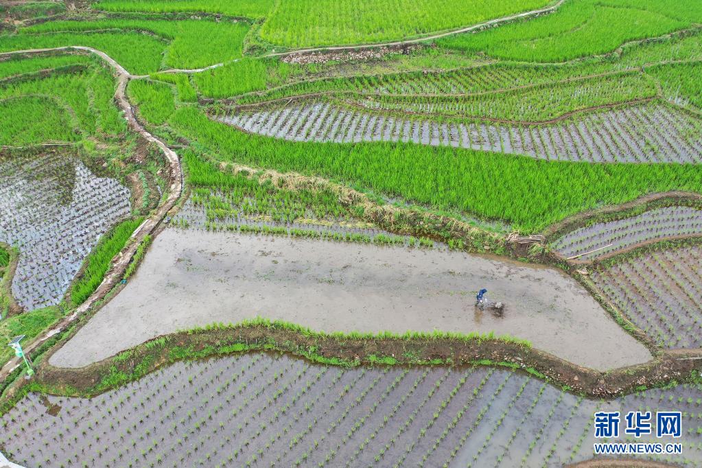 4月5日,村民在浙江省麗水市景寧畬族自治縣大漈鄉(xiāng)梯田里翻耕,以備種植茭苗(無(wú)人機(jī)照片)。