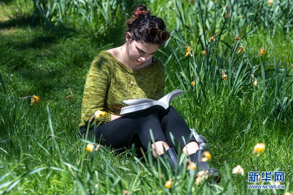4月17日,一名女子在英國倫敦一個公園的花叢中讀書。