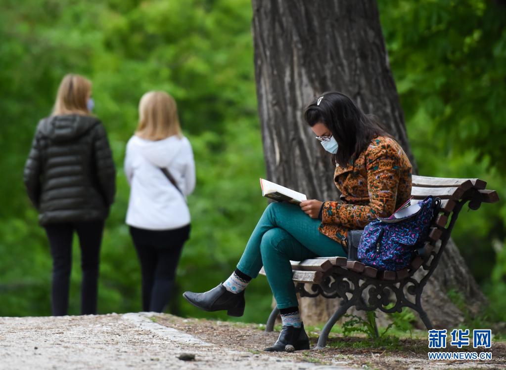 4月15日,一名女子在西班牙馬德里一個(gè)公園內(nèi)讀書。