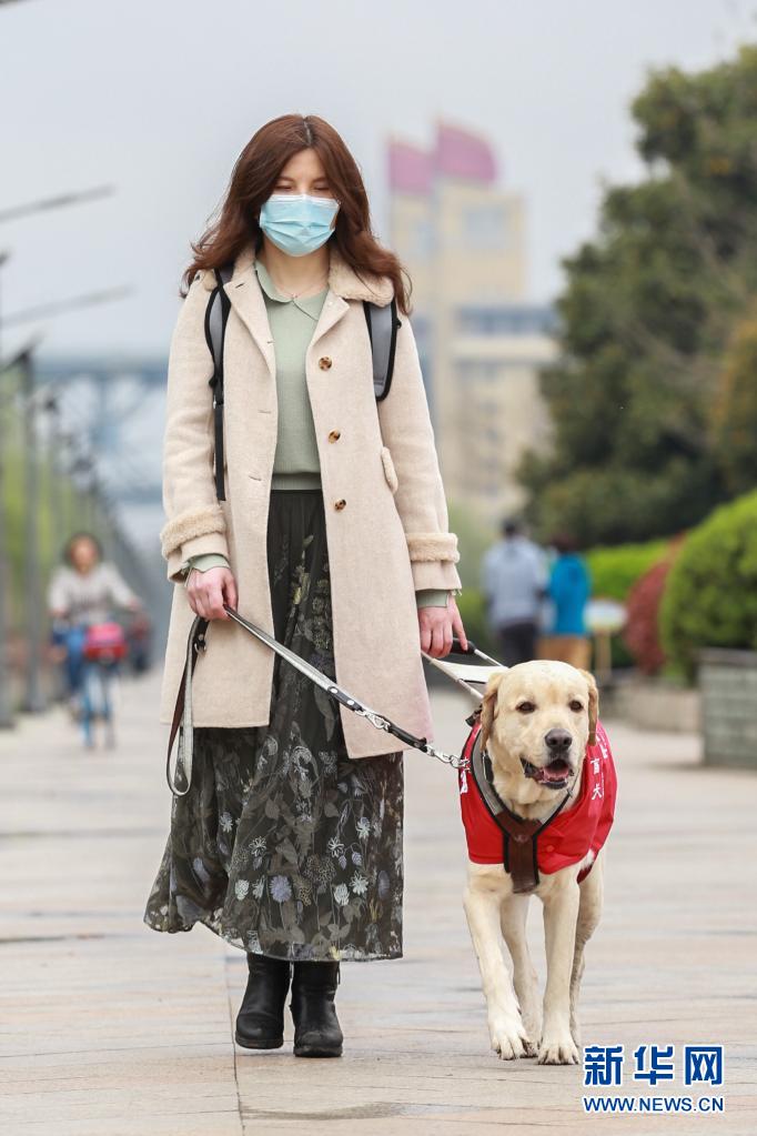導(dǎo)盲犬“Bingo”陪伴李靜在南京長江邊的景觀帶散步(3月27日攝)。 新華社發(fā) (張夢 攝)