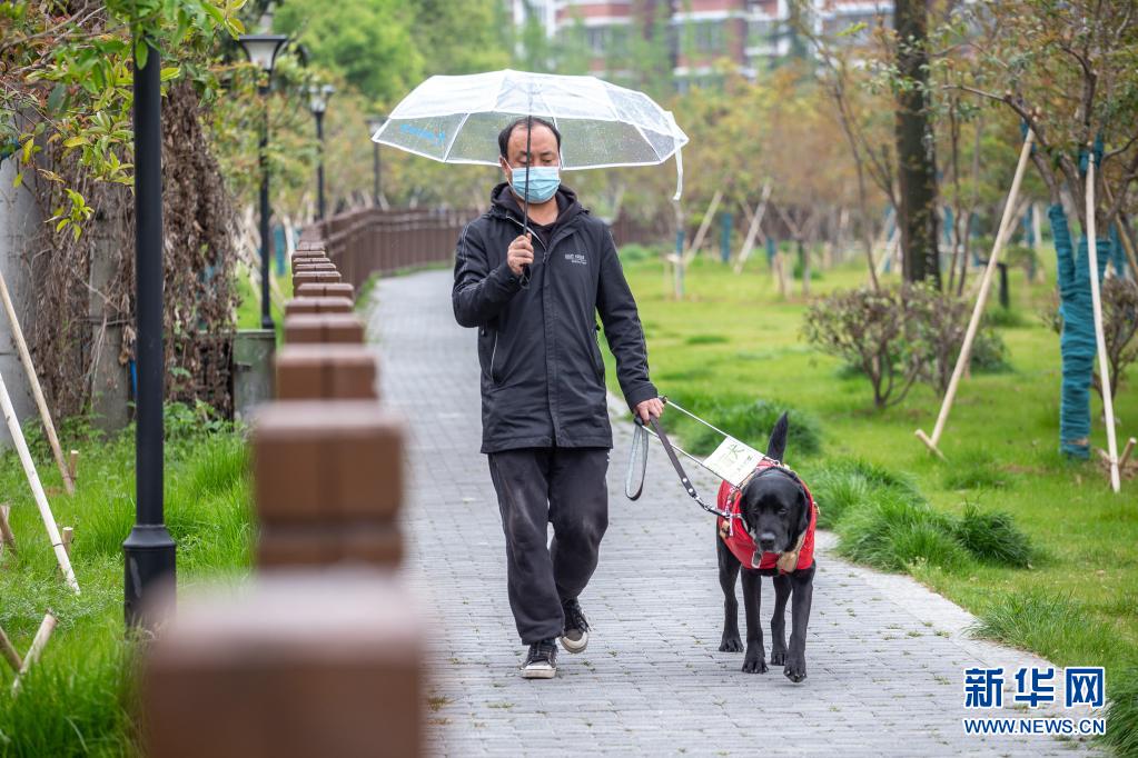 吳虎剛今年45歲,和同是盲人的妻子經(jīng)營著一家盲人推拿診所。每天上班,導盲犬“C羅”都會陪伴吳虎剛從家走到診所(4月11日攝)?! ⌒氯A社發(fā) (張夢 攝)
