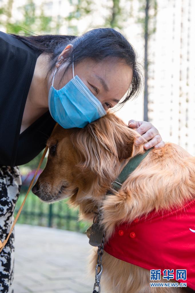 生活在南京市建鄴區(qū)的陳冬梅與導(dǎo)盲犬“果凍”在一起(4月4日攝)。 新華社發(fā) (張夢(mèng) 攝)
