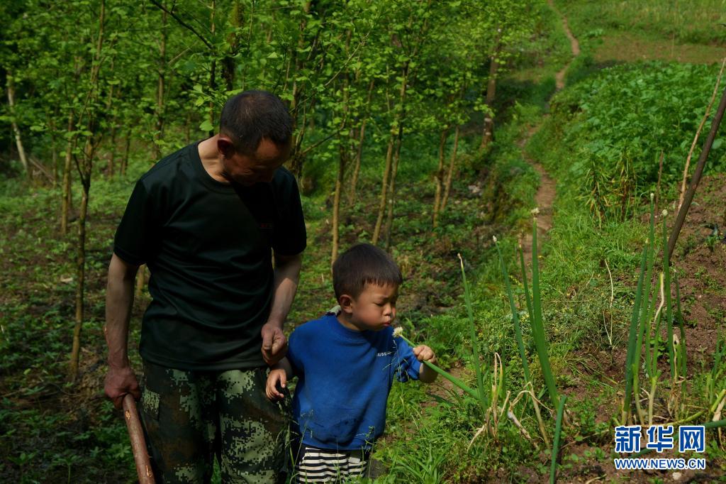 5月4日,林興聰帶著孫兒林關(guān)邱栩去地里勞作。 新華社記者 江宏景 攝