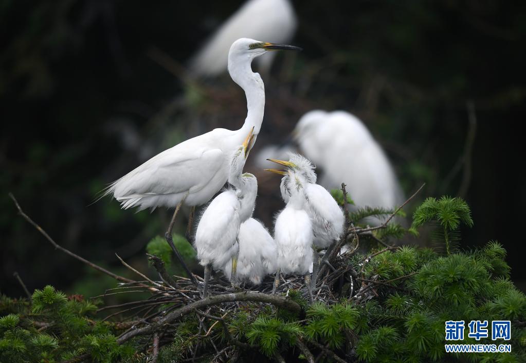 在南昌市新建區(qū)象山森林公園內(nèi),白鷺和雛鳥(niǎo)們?cè)谝黄穑?月18日攝)。