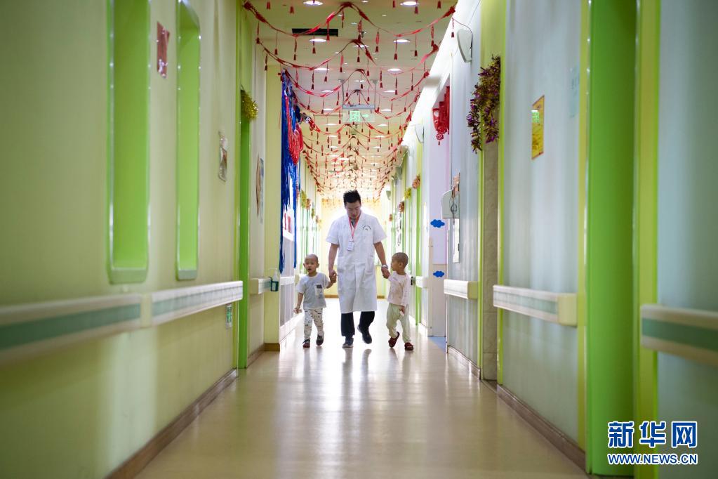 在太原市社會(兒童)福利院,黨龍祥帶孩子們在樓道散步(5月26日攝)。新華社記者 楊晨光 攝