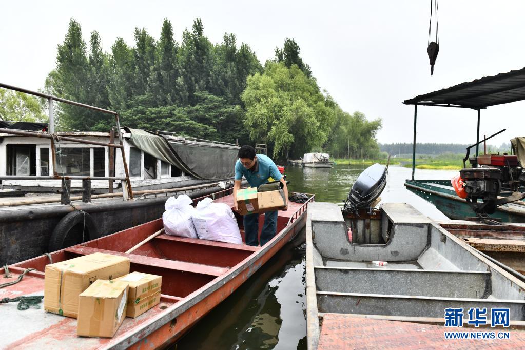 6月20日,在微山縣南陽鎮(zhèn),郵遞員王少朋往郵船上裝郵件,準備為村民投遞。
