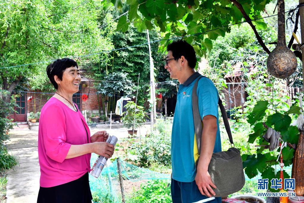 6月20日,在微山縣南陽鎮(zhèn),郵遞員王少朋(右)和柳溝村村民交談。