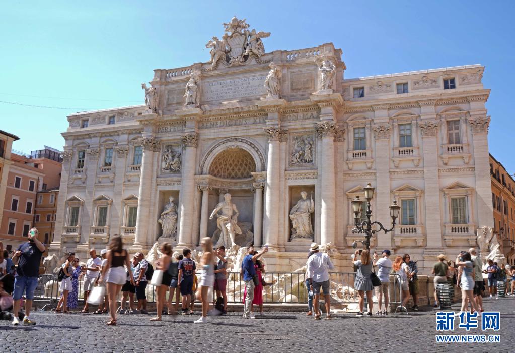 7月11日,人們在意大利羅馬的許愿池前參觀拍照。