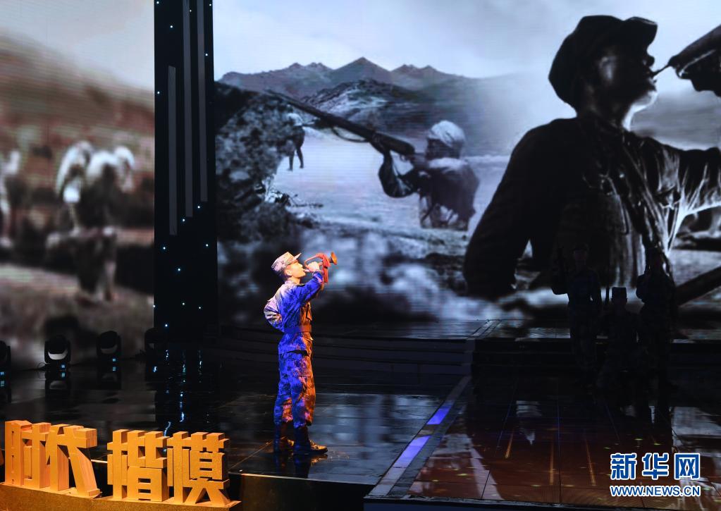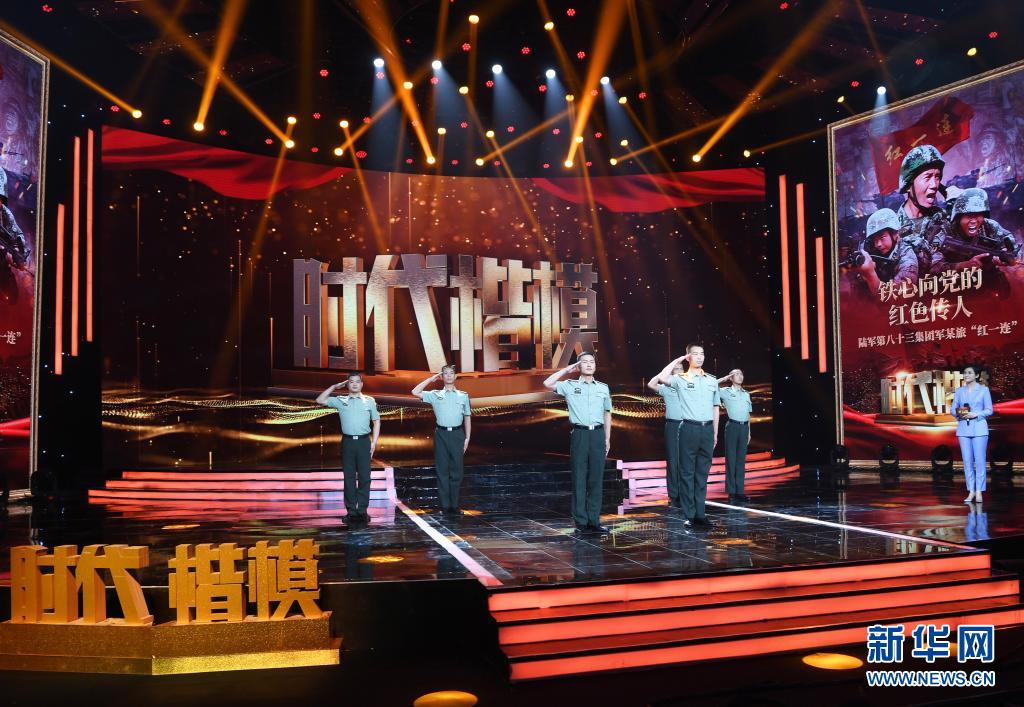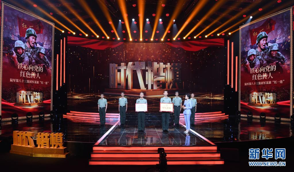 在“時(shí)代楷?!卑l(fā)布儀式上,陸軍第八十三集團(tuán)軍某旅“紅一連”官兵代表表演節(jié)目《紅色堡壘》(7月23日攝)。新華社記者 張永進(jìn) 攝