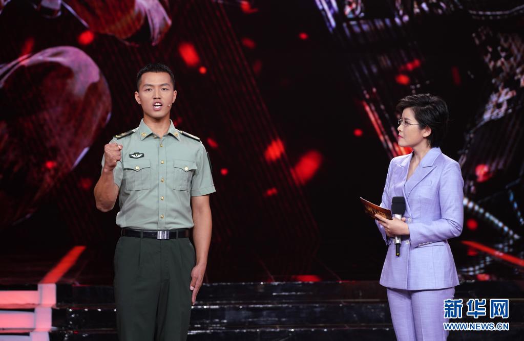 在“時(shí)代楷?!卑l(fā)布儀式上,陸軍第八十三集團(tuán)軍某旅“紅一連”副班長(zhǎng)徐謙(左)講述黨員骨干“跟我來”的故事(7月23日攝)。新華社記者 張永進(jìn) 攝