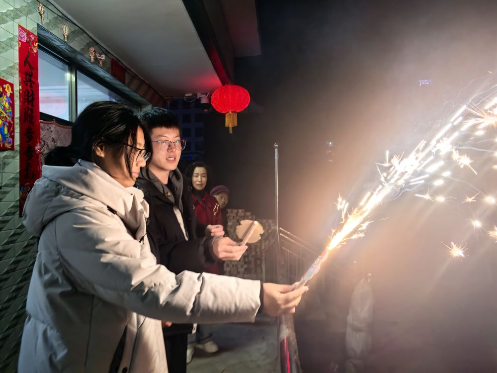 湫水孩子们燃放烟花迎新春。