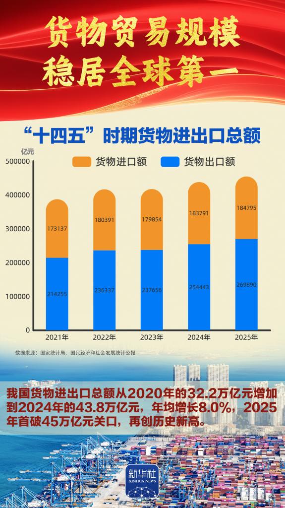 “十四五”胜利收官,“十五五”崭新开局。我国经济总量完成“四连跳”,跃上140万亿元大关,经济实力、科技实力、综合国力跃上新台阶,中国式现代化迈出新的坚实步伐,第二个百年奋斗目标新征程实现良好开局。2026年全国两会召开,举世瞩目。我们梳理出九组数据,一起感受胜利收官的壮阔历程、启新开局的高光时刻。