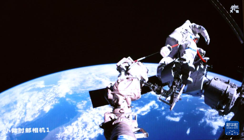 这是4月16日在北京航天飞行控制中心屏幕上拍摄的神舟二十一号乘组航天员武飞在舱外工作的画面。新华社发(张帆 摄)