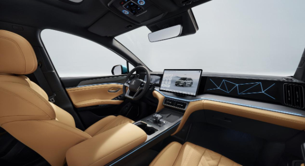 进入车内,以宋代庭院艺术为灵感的宋韵宽奢座舱映入眼帘。贯穿式一体化面板与中置旋转悬浮Pad形成错落有序布局,极富层次感。副驾智能3D景深氛围灯光影变幻、呼吸起伏、层层有景。31色氛围灯变换随心,搭配金沙陶内饰配色,诠释豪华魅力。