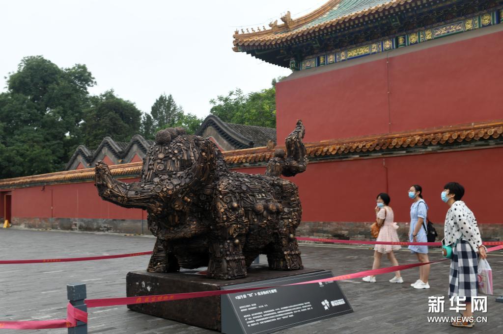 這是故宮內(nèi)展出的《福牛辭“舊”》廢棄物再生雕塑(7月13日攝)。新華社記者 金良快 攝