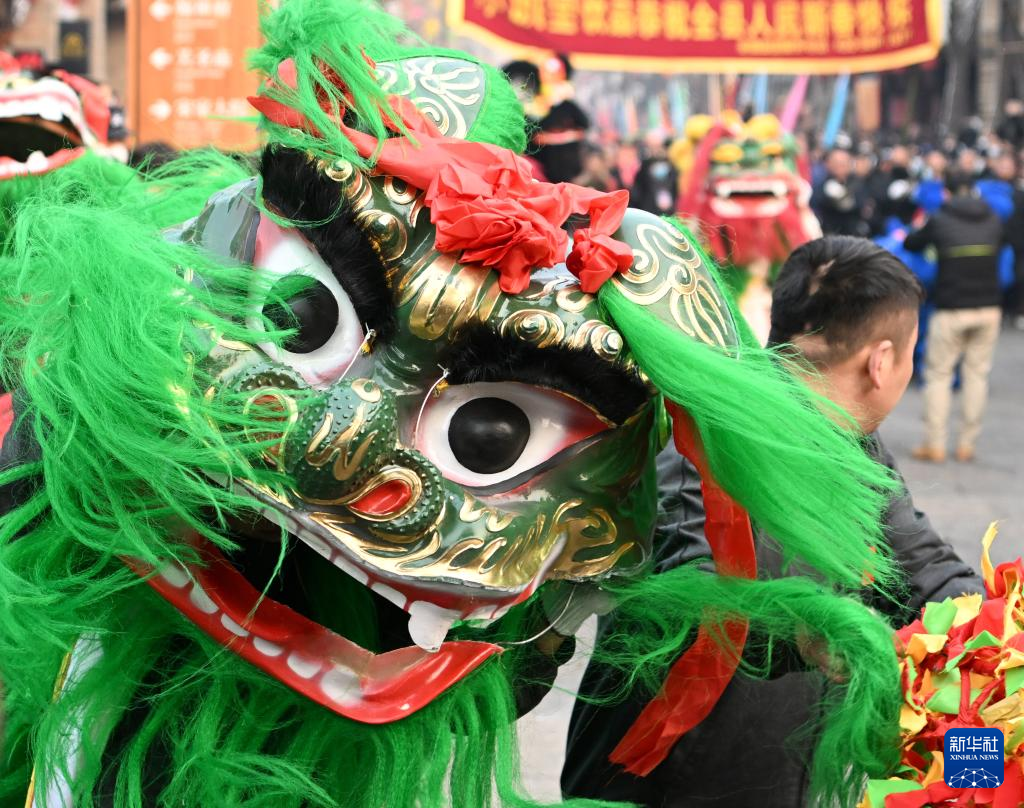2月6日,社火团队的演员在庙会上表演舞狮(无人机照片)。