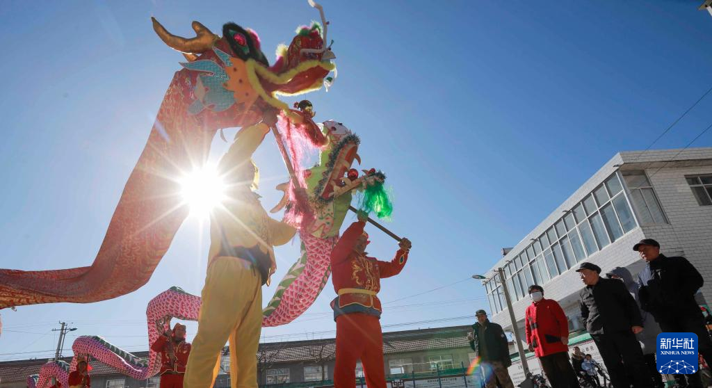 2月21日,河北省遵化市铁厂镇铁厂村的民间艺人在表演舞龙民俗节目。