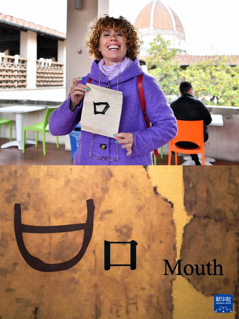 拼版照片:上图为2023年4月13日,在意大利佛罗伦萨大学孔子学院举办的学写汉字活动上,一名参与者展示她学习书写的汉字“口”(新华社记者 金马梦妮 摄);下图为2023年4月19日在位于中国河南省安阳市的中国文字博物馆拍摄的“口”字甲骨文(左)(新华社记者 李安 摄)。