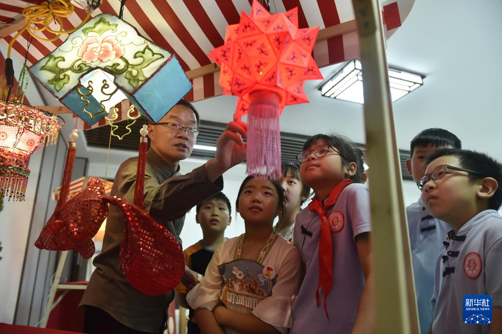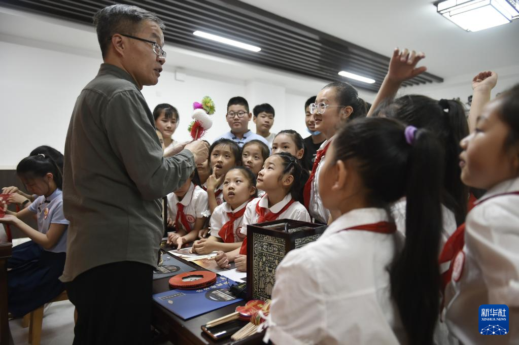 6月8日,张俊涛(前左)在郑州经济技术开发区列子小学参加非遗进校园活动,向学生们介绍彩灯制作技艺。