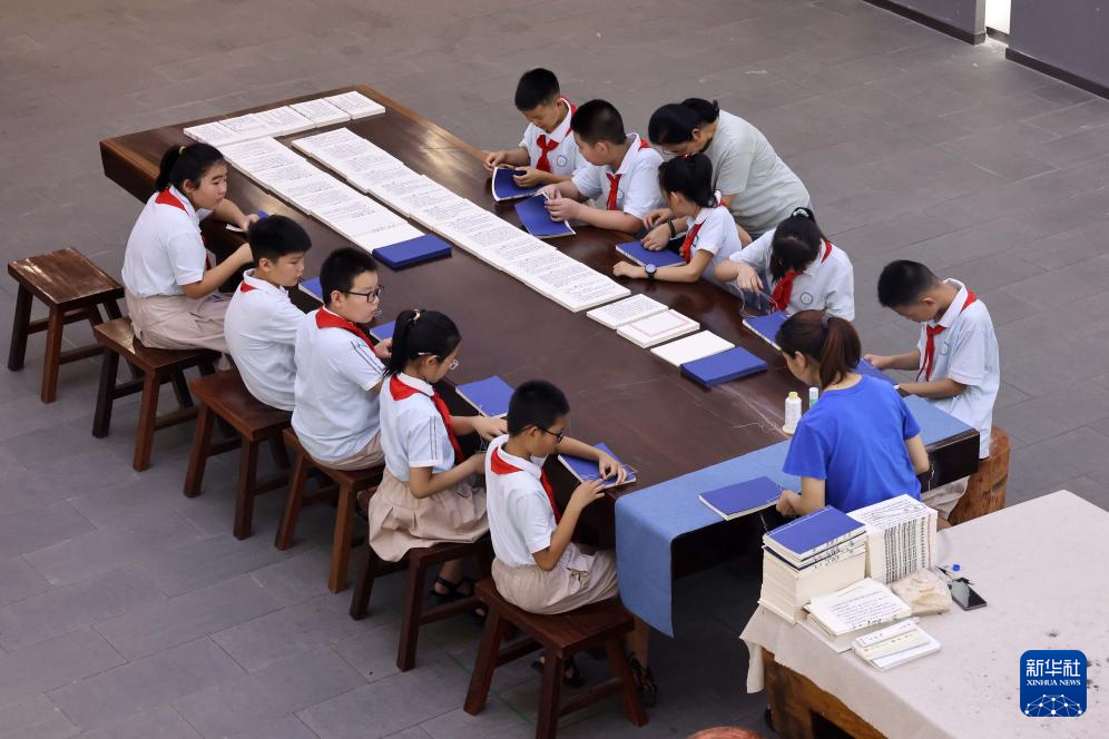 7月20日,在河北省沧州市吴桥县河北线装书博物馆,工作人员教吴桥县新华小学学生学习线装书制作技艺。