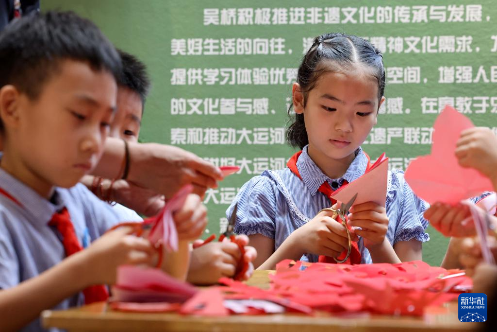7月20日,在河北省沧州市吴桥县大运河文化展馆,吴桥县实验小学学生学习吴桥杂技剪纸技艺。