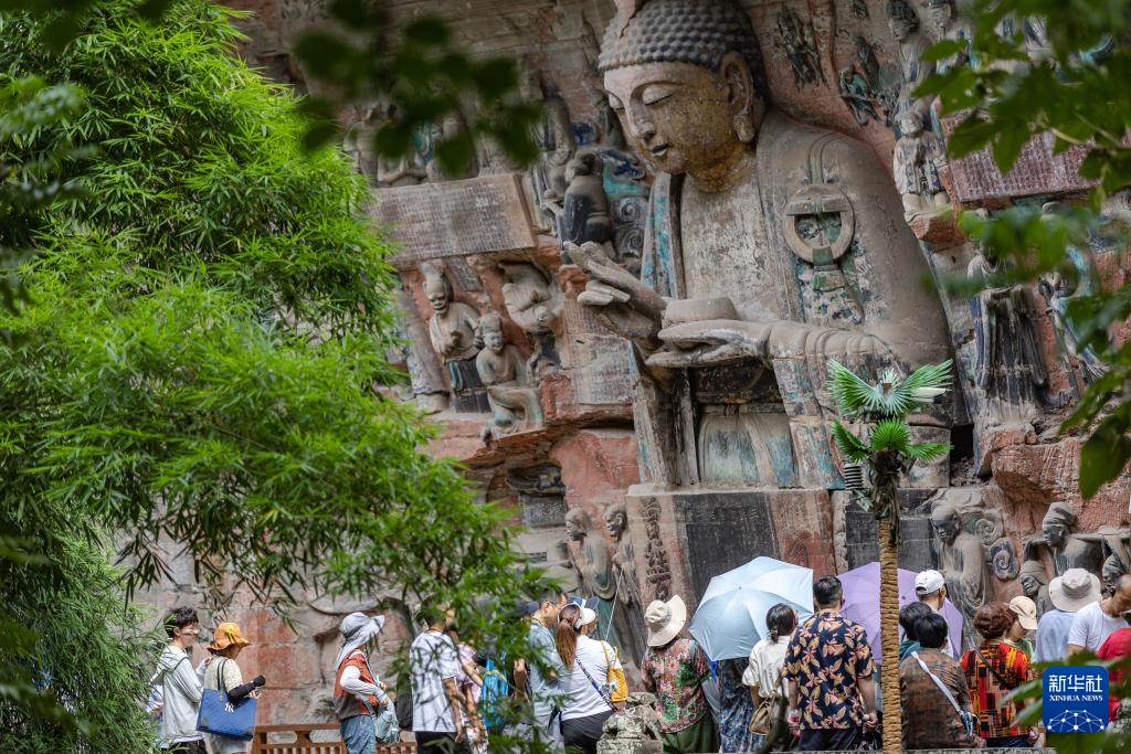 8月19日,游客在大足石刻宝顶山景区参观。