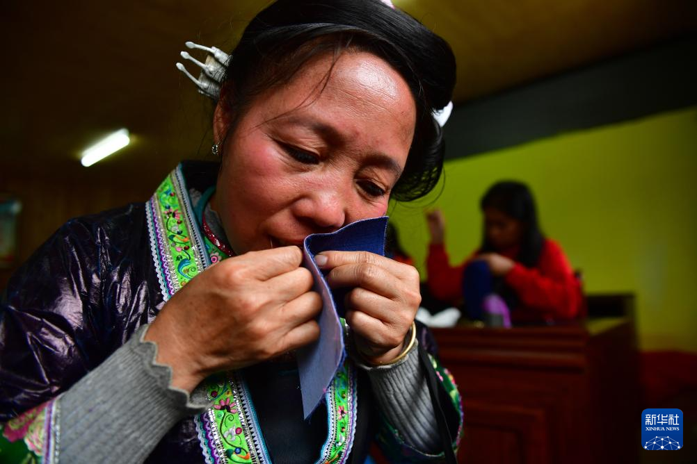 乌英苗寨妇女梁足英(左一)在刺绣(2019年10月18日摄)。