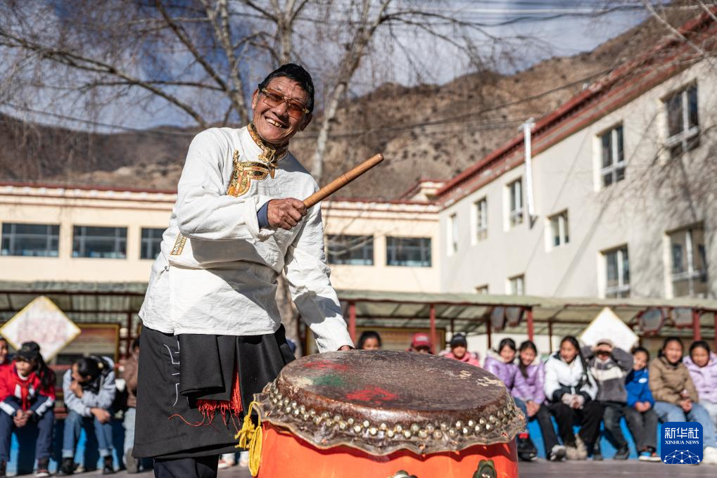 在西藏昌都市洛隆县硕督镇小学,邓巴阿尼在击鼓伴奏(1月19日摄)。