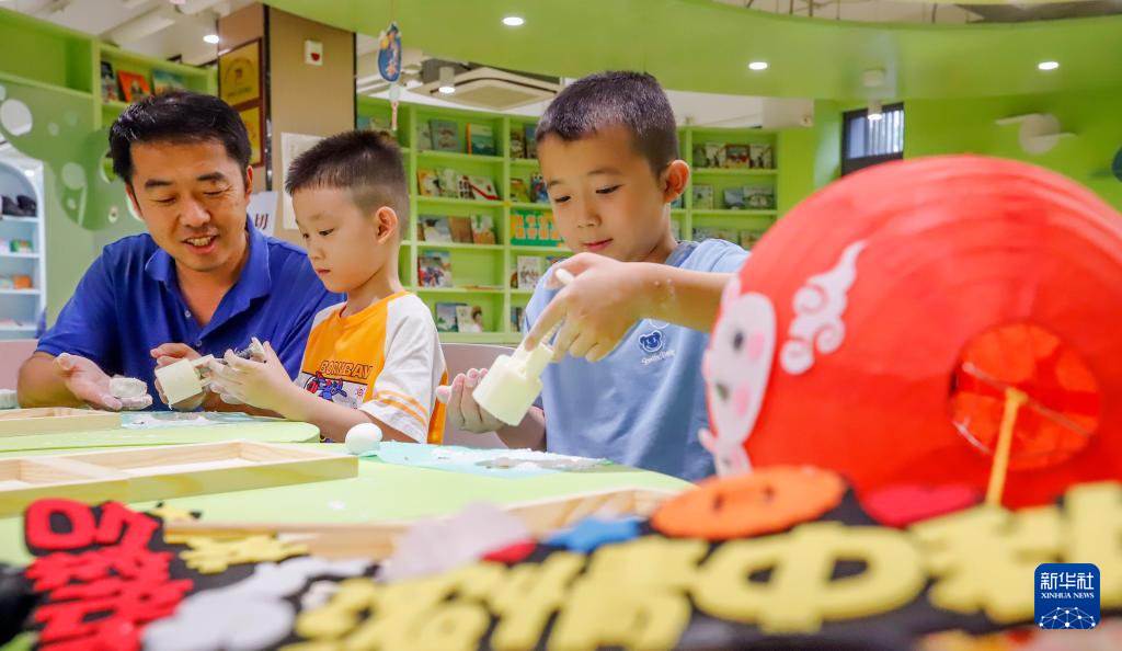 9月8日,在河北省遵化市新华书店举行的儿童迎中秋主题活动中,工作人员和小朋友一起做手工月饼。