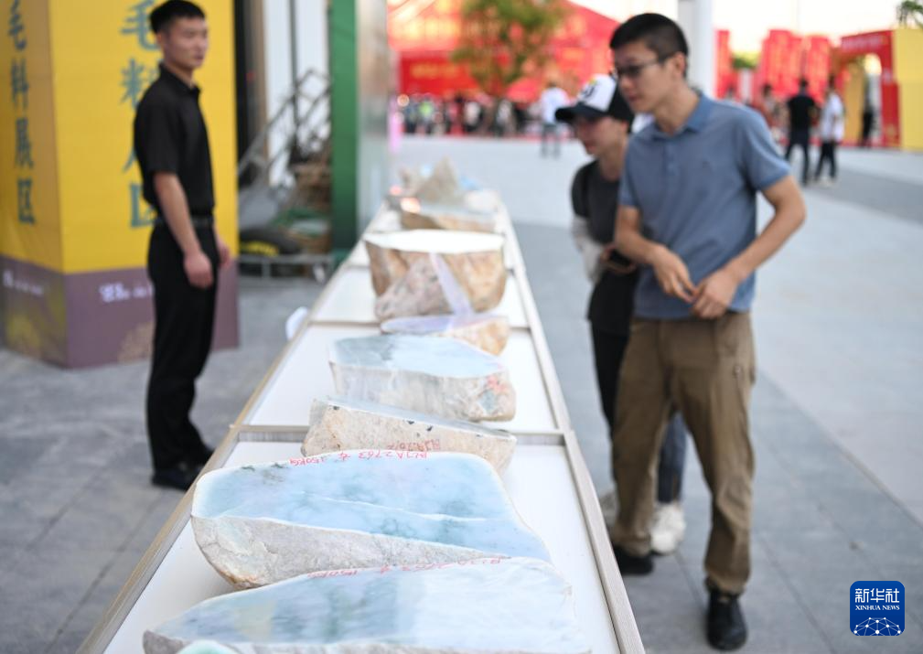 9月29日,观众在开幕式上观看展示的玉石毛料。