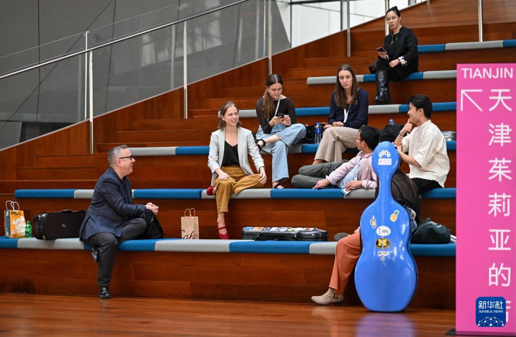 美国茱莉亚415古乐团师生在天津茱莉亚学院排练间隙交流(10月12日摄)。