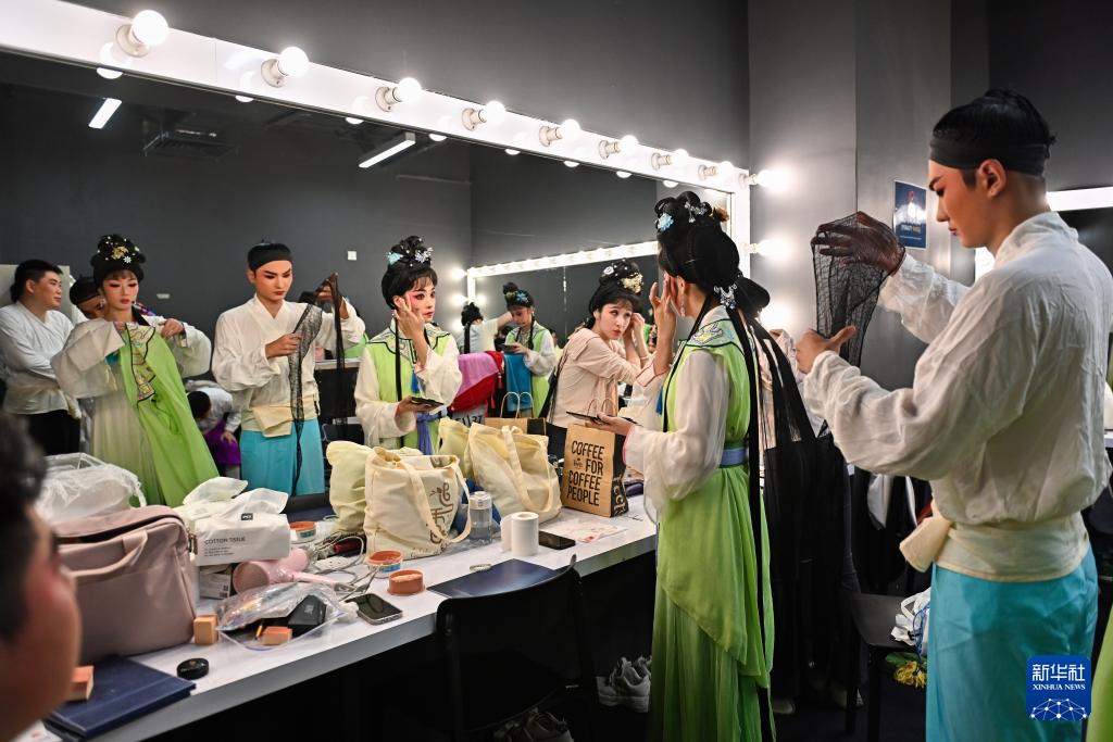 10月18日,在马来西亚吉隆坡,锡剧《追香记》的演员们在后台做表演前的准备。