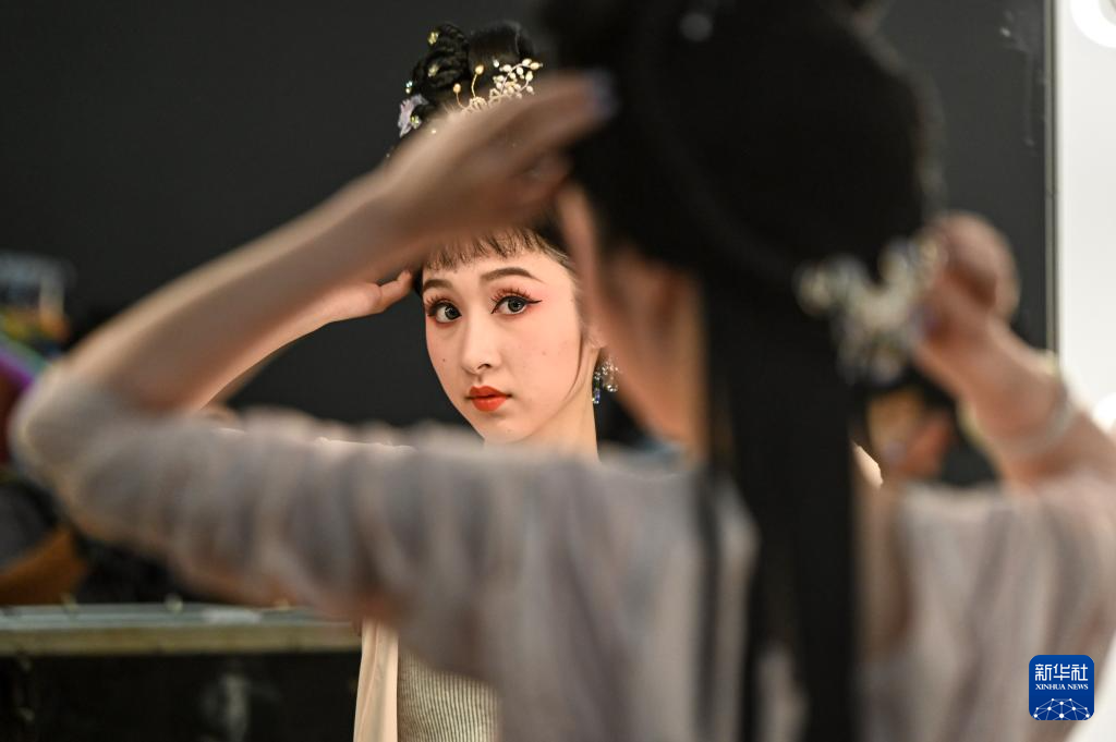 10月18日,在马来西亚吉隆坡,锡剧《追香记》的演员在后台做表演前的准备。
