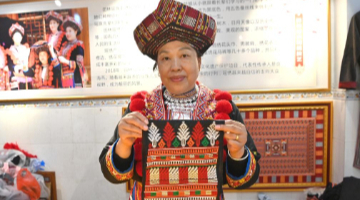 11月4日,黎族老人在位于海南保亭的槟榔谷文化旅游区展示黎族织锦技艺。