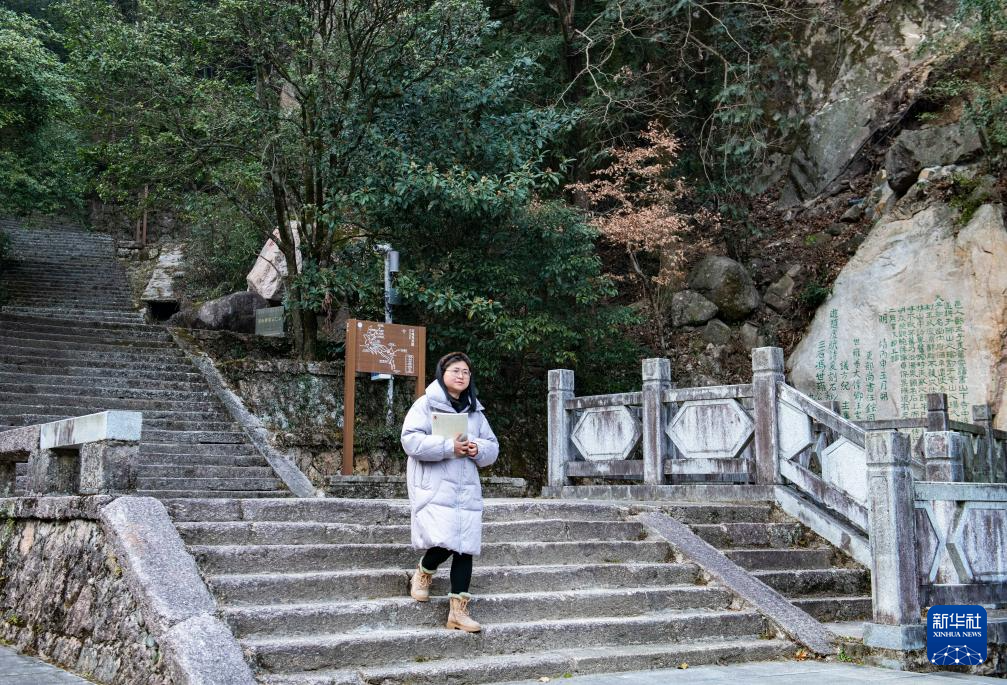 12月18日,黄山风景区文化事业管理办公室工作人员章静茹在巡查摩崖石刻情况。