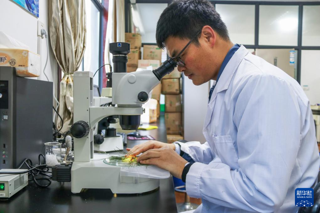 12月20日,黄山风景区管委会园林局高级工程师吴贻军在检验检疫室里观察松针样本。