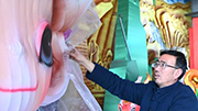 1月8日,苏红章在宁夏固原市隆德花灯传承基地生产车间为花灯裱糊。