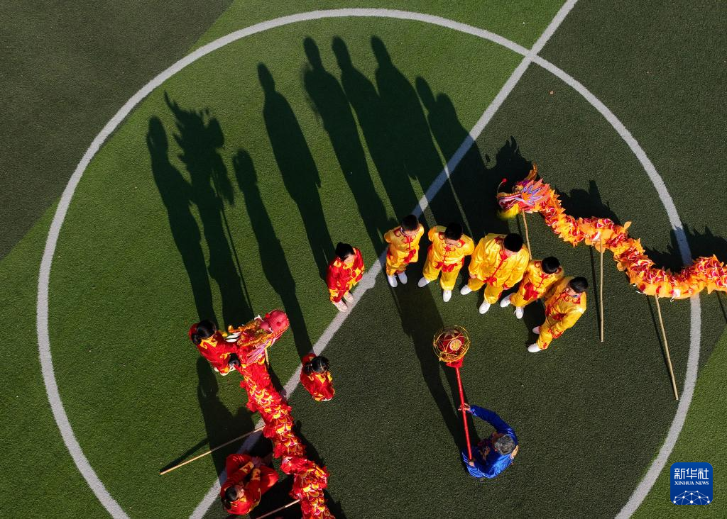 非遗传承人在江苏镇江句容市葛村中心小学辅导学生练习舞龙技艺(1月10日摄,无人机照片)。