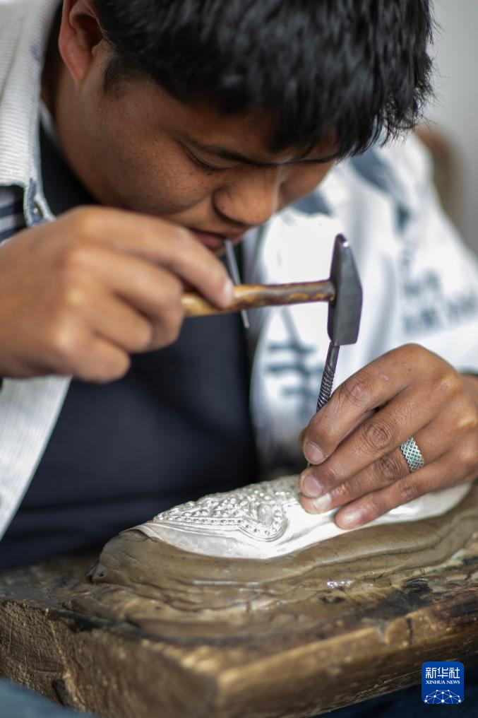 3月6日,扎西吉彩的手工匠人在錾刻银器。