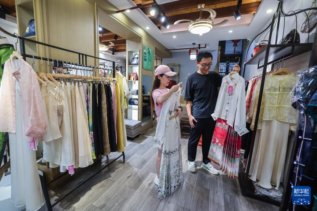 8月26日,游客在嘉兴市南湖区月河历史街区的一家店里挑选传统服饰。