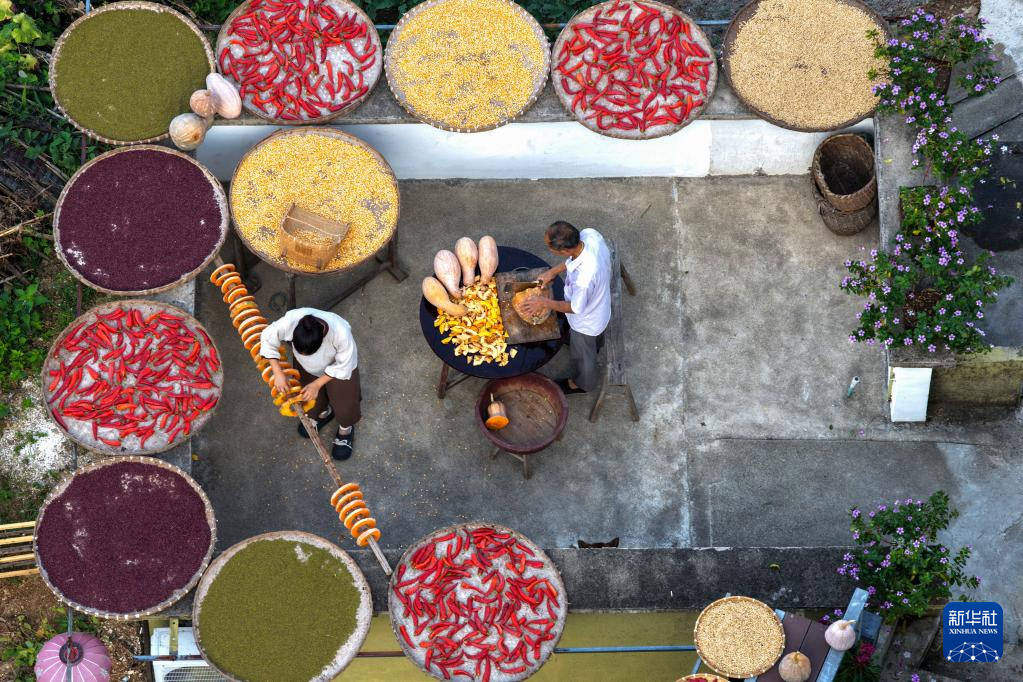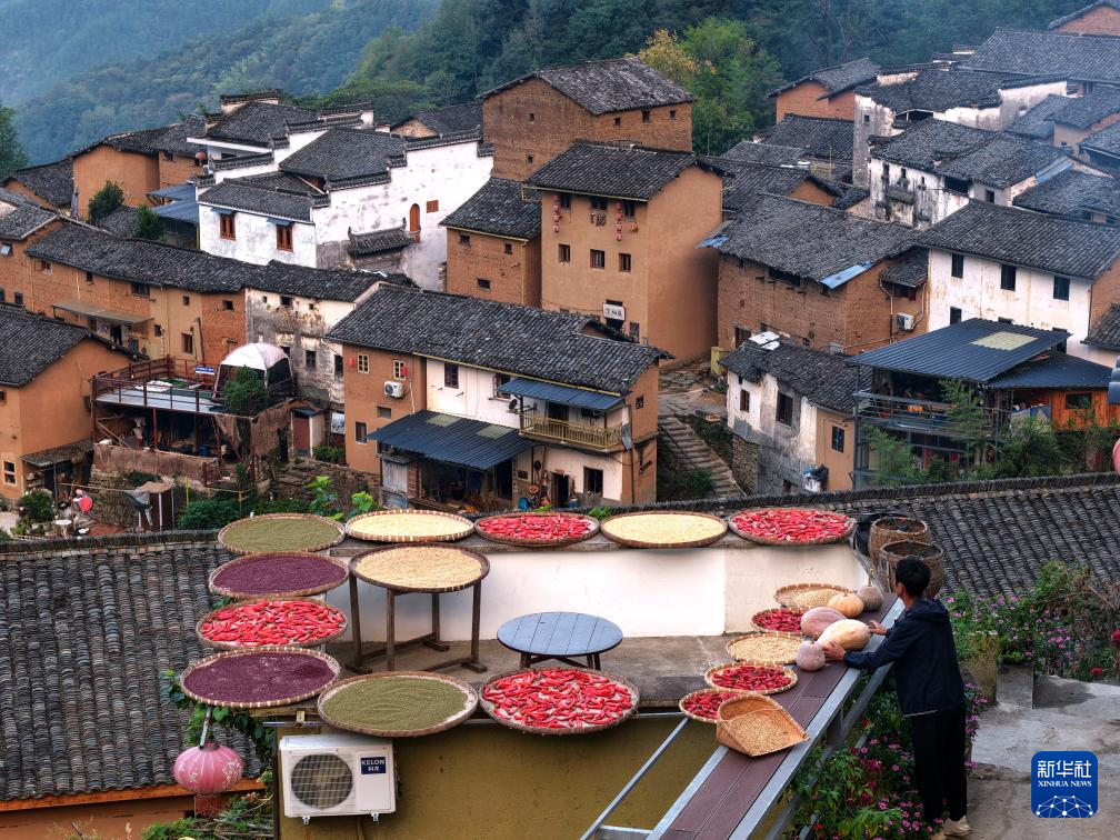 时值秋收时节,村民们利用晴好天气,将辣椒、玉米、山核桃等农作物晾晒在房前屋后,形成独具特色的“晒秋”景观。
