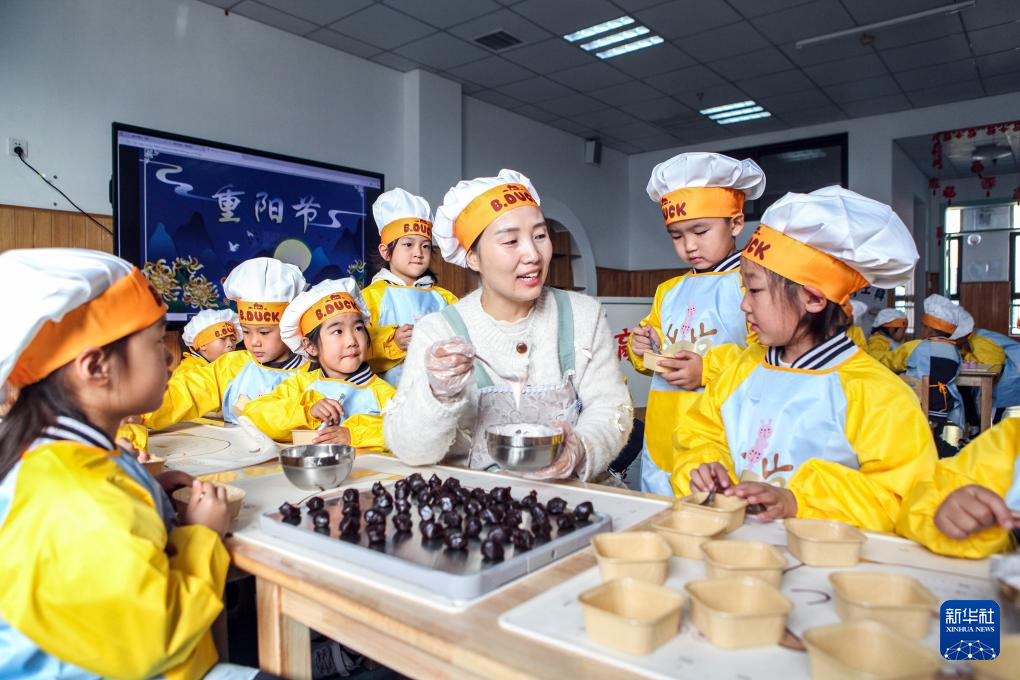 10月27日,在河南省焦作市博爱县县直幼儿园,老师指导小朋友在食育坊里制作重阳糕。