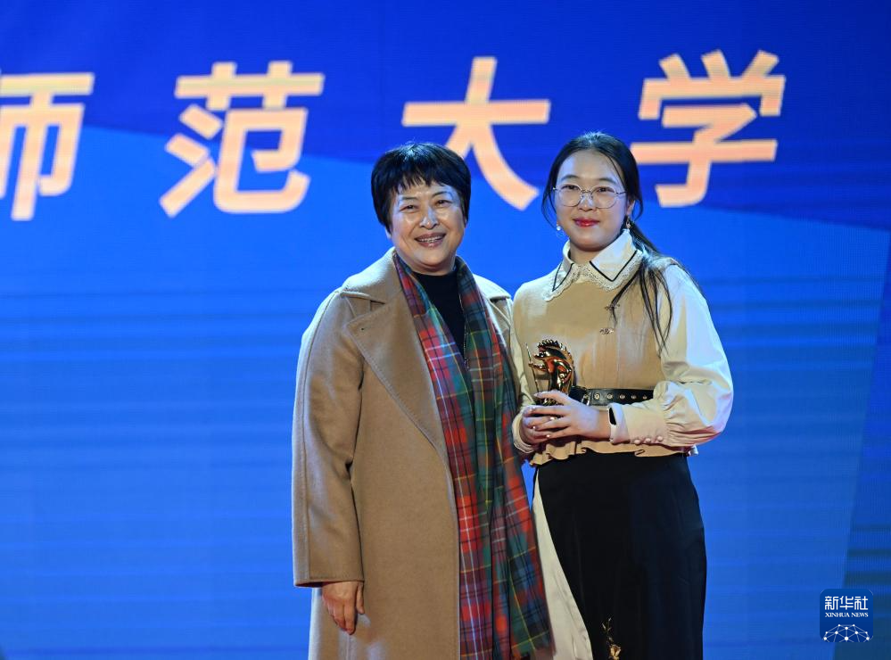 11月22日,北京戏剧家协会副主席王宝社(右)为获得微短剧单元“微短剧之星”的西南民族大学《狮·心》剧组代表颁奖。