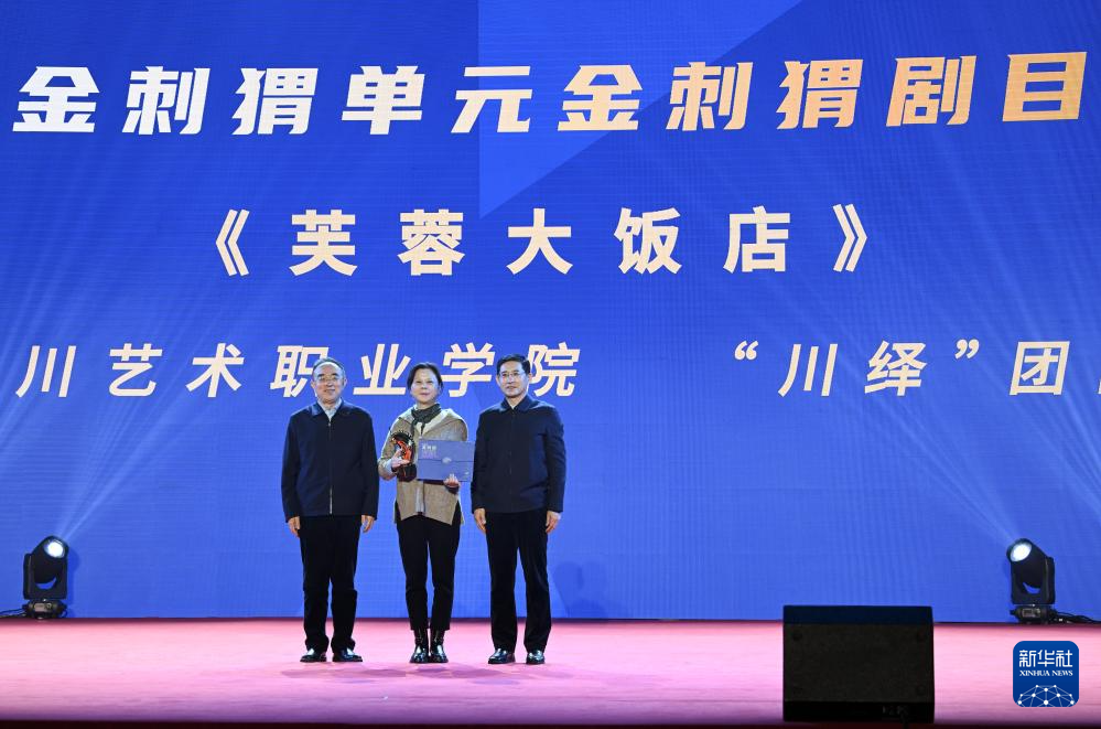 11月22日,获得金刺猬单元“金刺猬剧目”的四川艺术职业学院《芙蓉大饭店》剧组代表上台领奖。