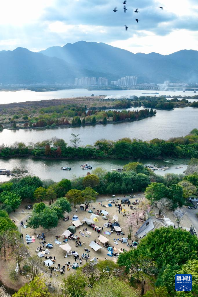 1月2日,在福州闽江之畔的闽侯法治廉政文化公园,游人在户外草坪休闲度假(无人机照片)。